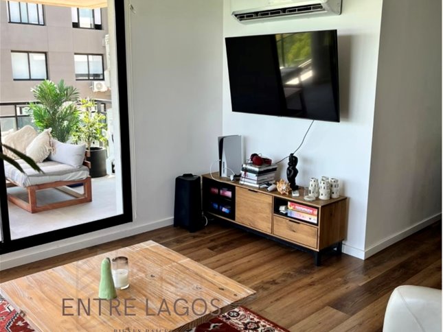 Living comedor con salida a amplio balcón en L con parrillero y aire acondicionado.